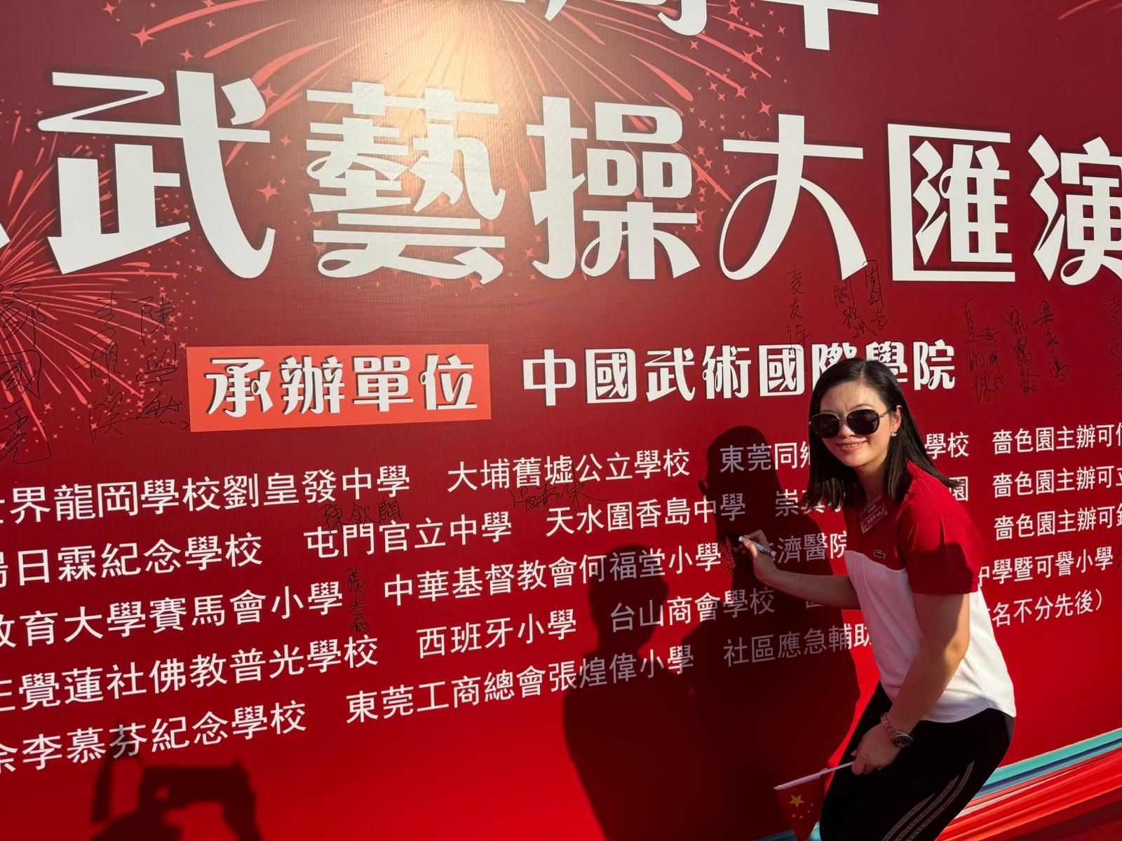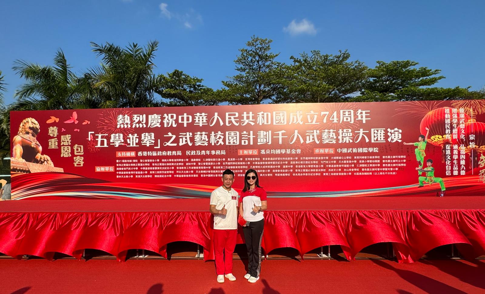 本校武藝學員出席國慶武藝千人大匯演,天公造美,陽光燦爛,同學不怕辛勞,完成了兩小時的綵排及匯演。馮燊均夫人鮑俊萍女士及民政事務局局長麥美娟致辭後千人匯演正式開始,我校升旗隊派出兩位代表協助進場展示大型國旗,然後武藝操學員浩浩蕩蕩進場進行千人匯演,同學表現出堅毅意志,雖然辛苦,仍能順利完成匯演,能出席如此盛大的活動,真是難得的經驗。