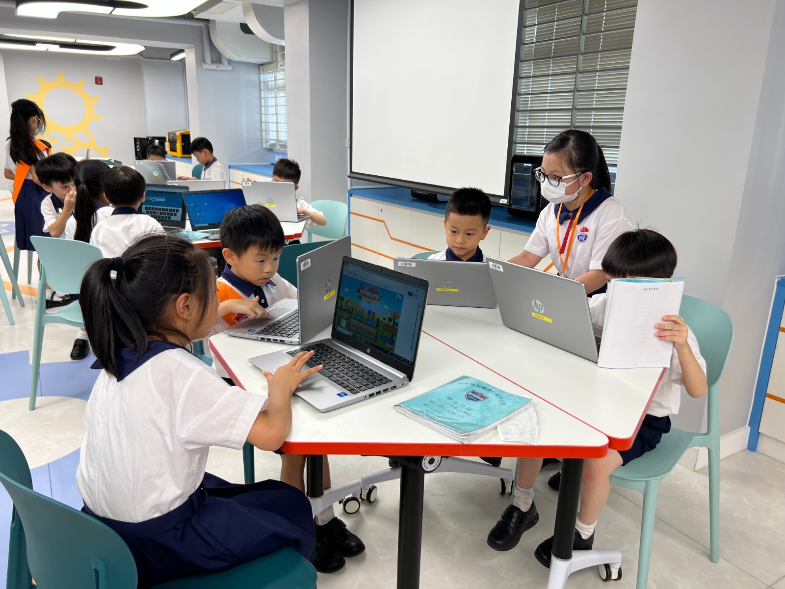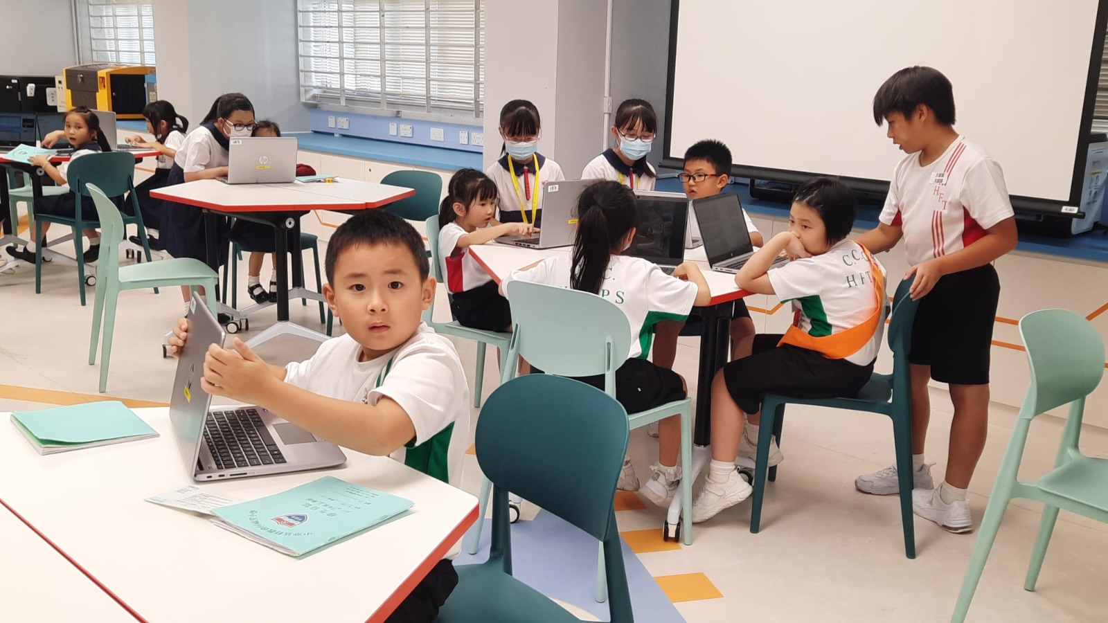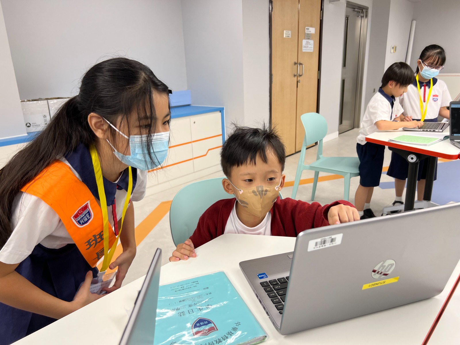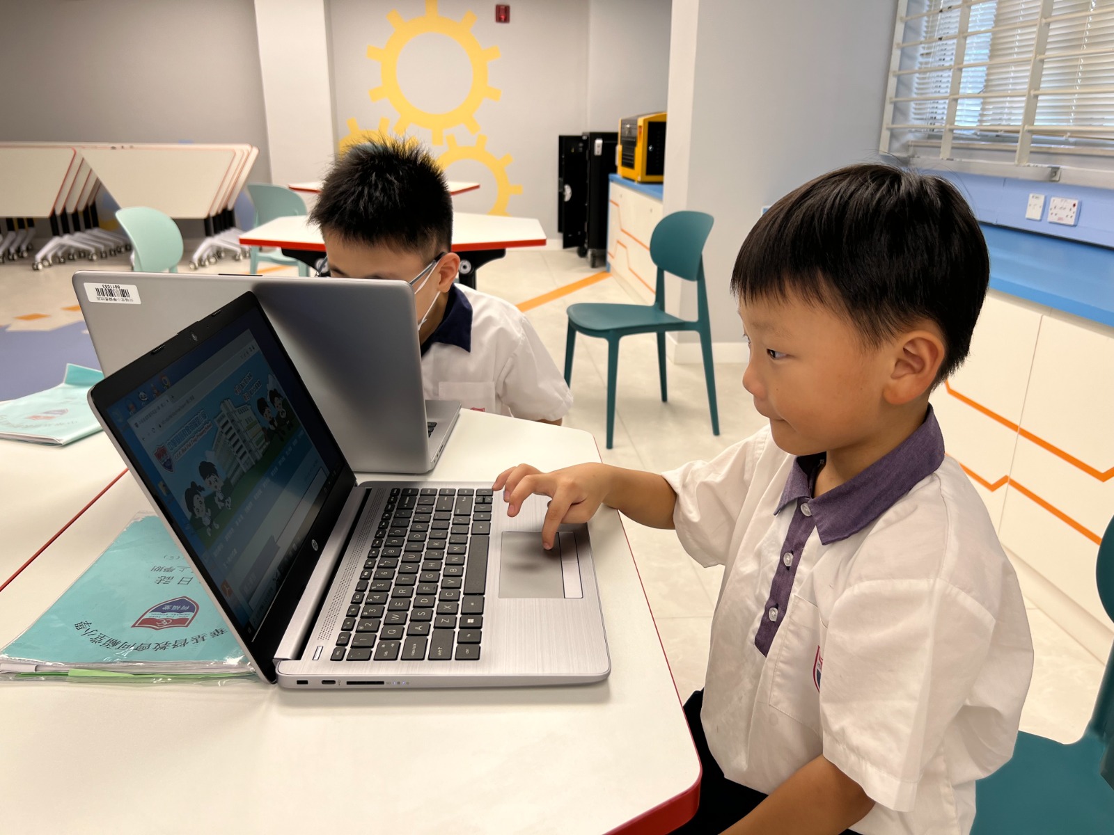 學生在ITPC room使用手提電腦,進行網上學習遊戲,電腦室管理員協助有需要同學,同學享受善用科技的樂趣。