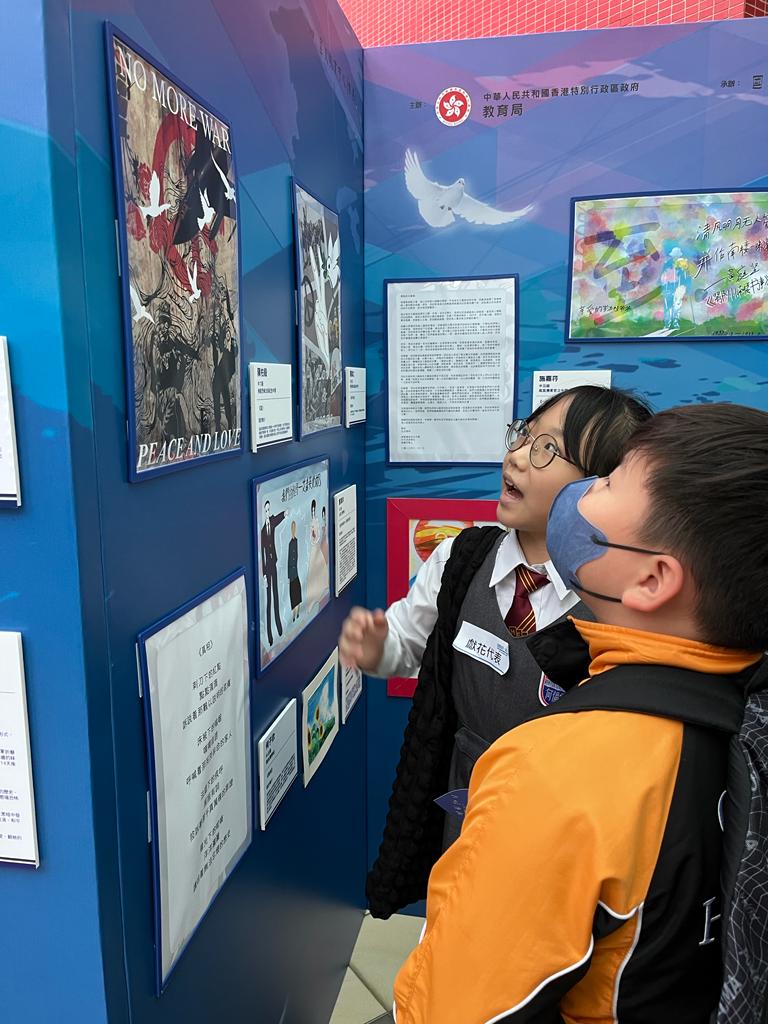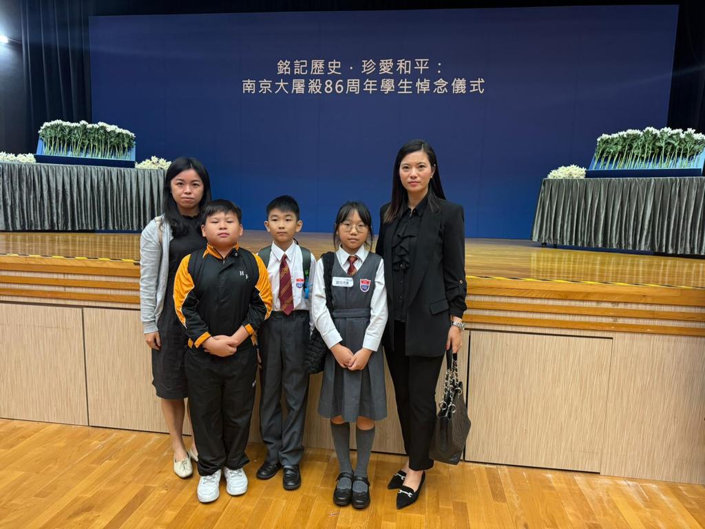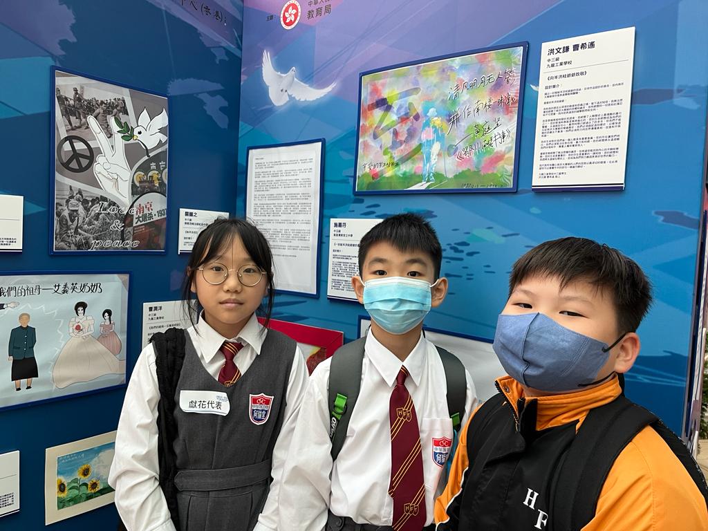 下午,本校學生代表4A張愷情、4A文佑天、4D周善果同學參與由教育局主辦,國史教育中心承辦的「銘記歷史・珍愛和平」——南京大屠殺86周年學生悼念活動暨學生作品展覽,希望學生可以從認識歷史,明白到和平的重要性。