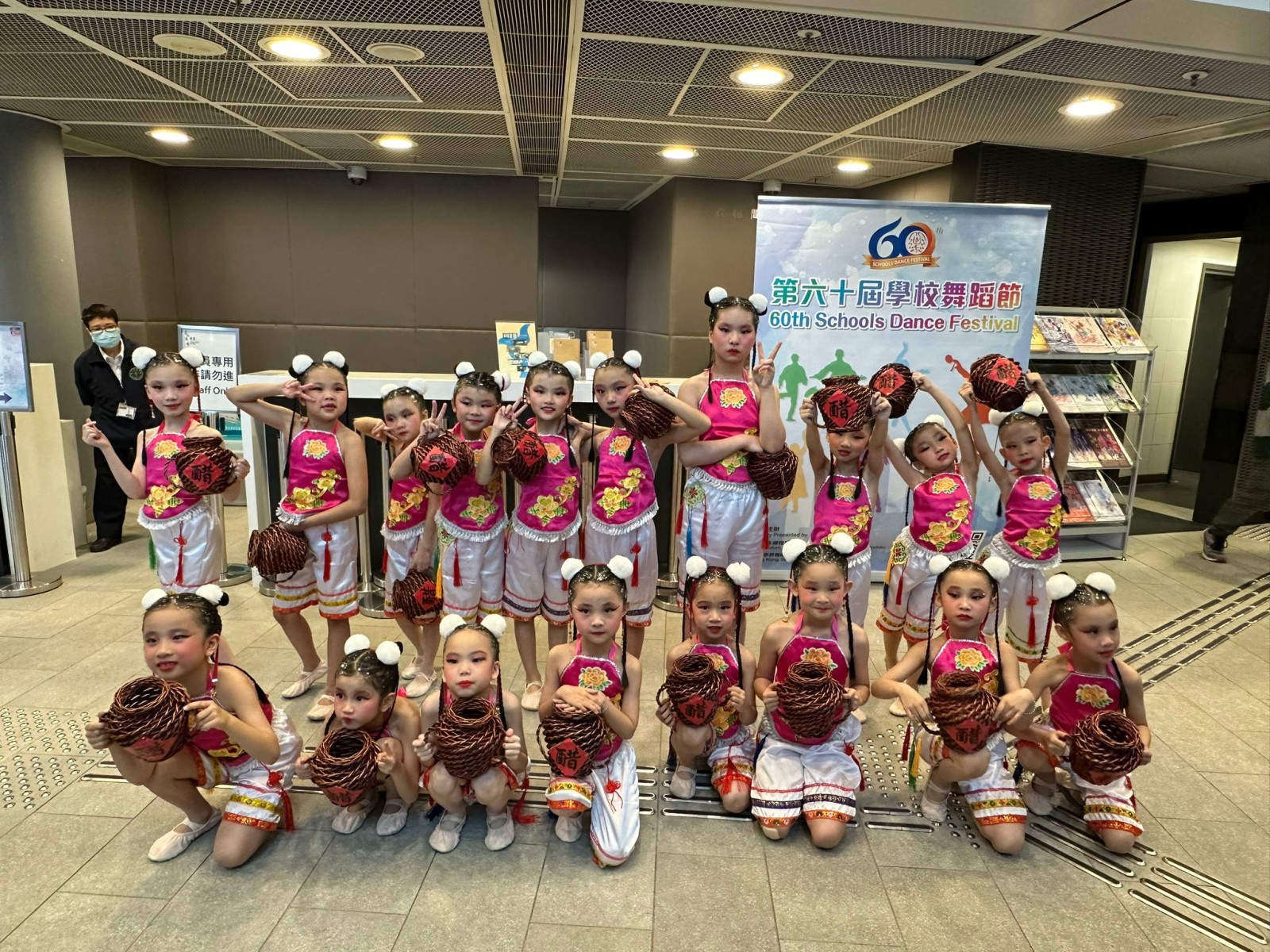中國舞校隊(低年級組)參加第六十屆校際舞蹈節低小組別獲得甲級獎!初次參加比賽毫不畏懼,展示優秀舞蹈表現力,是聖誕假期努力訓練的成果。活潑可愛的笑容加上整齊一致的動作讓本場評分嚴謹的評判給予舞蹈高度讚賞的評語,欣賞隊員的努力表現,能帶出小女孩們慶祝收成玩得不亦樂乎的開心。
