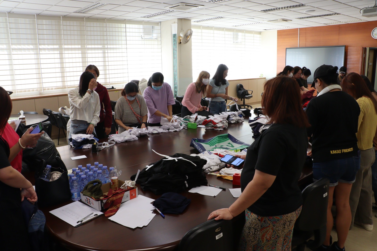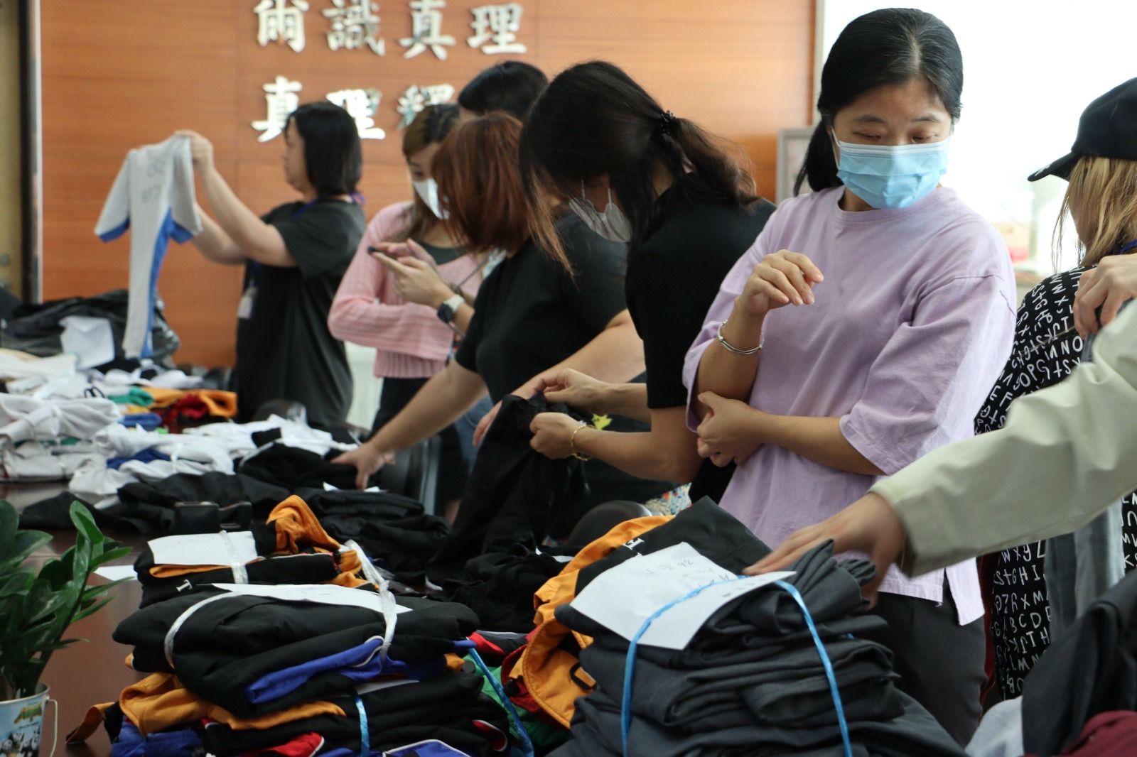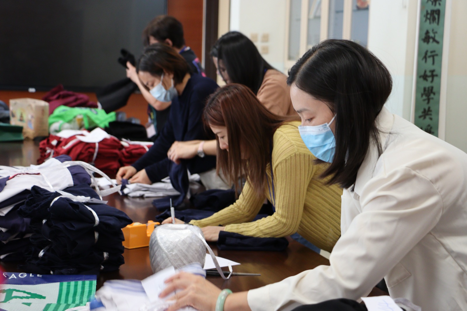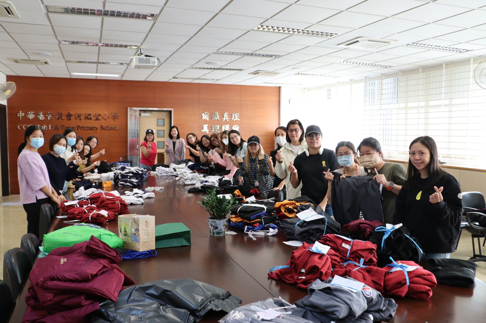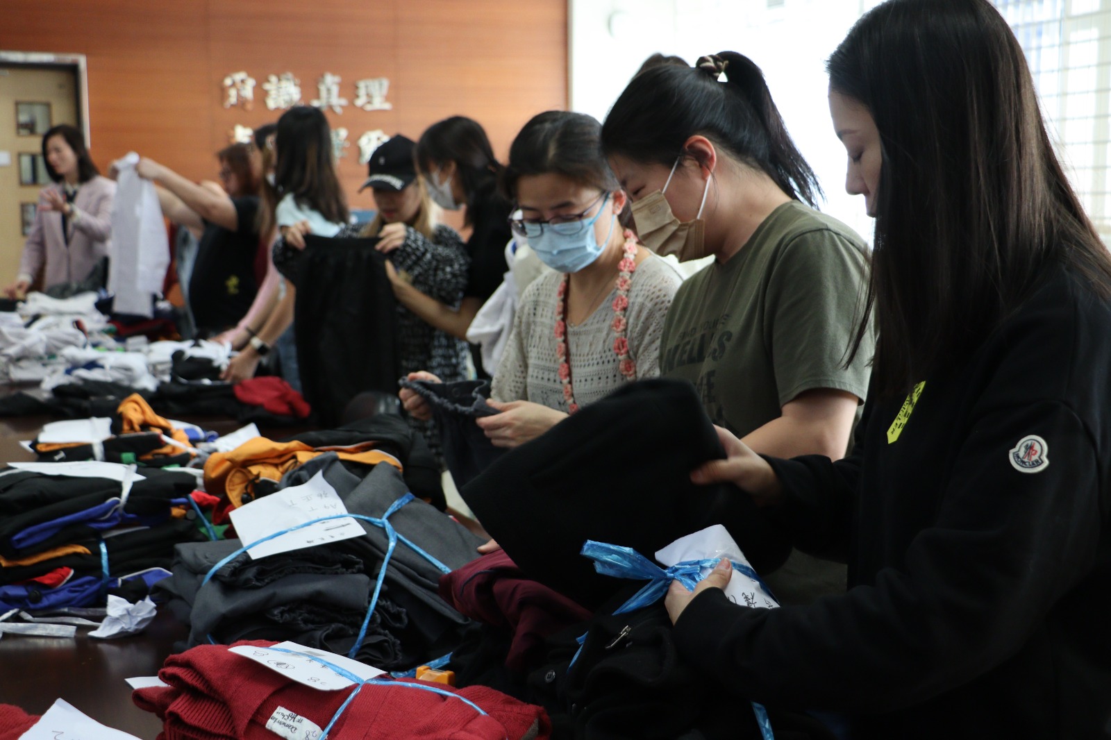 而家教會組織家長義工們一早到校幫忙分類及執整環保校服,以準備10月30日的環保校服義賣活動。