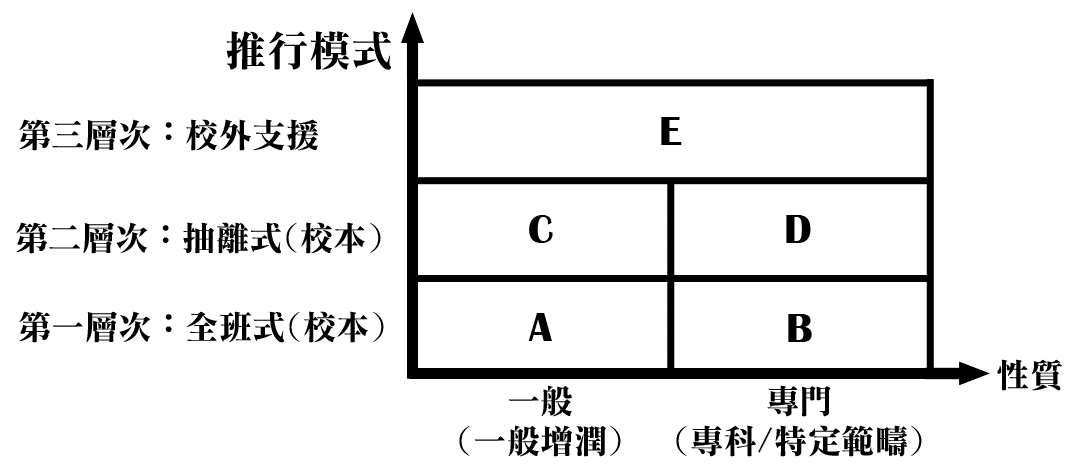 第一層次﹕ A︰在一般課程加入高層次思維技巧、創造力和個人及社交能力等三大資優教育元素。 B: 在一般課堂按學生的特質實施分組教學、增潤及延伸專門性學習領域的課程內容。 第二層次﹕ C﹕以抽離方式在一般課堂以外進行一般性增潤課程(例如領袖才能訓練、創造力訓練等)。 D﹕以抽離方式在一般課堂以外進行專科特定範疇的延伸課程(例如數學、視藝等)。 第三層次﹕ E:為需要校外支援的特別資優學生提供個別化的學習安排(例如輔導、良師計劃、提早入學等)。